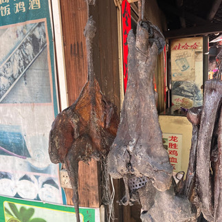 Auf dem Weg sahen wir sehr trocken geräucherte Tiere und Würste, Fische in einem aus Quellwasser gespeisten Aquarium und frische Ingwerpflanzen.