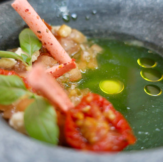 Als Einstimmungen aus der Küche kam eine recht pikante kühle Brühe aus Gurke, Tomate, Erbse, Yuzu, Jalapeño. Sehr nett.
