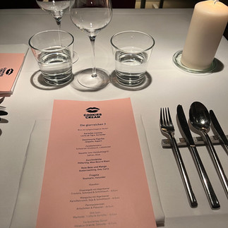 Es gibt auch eine Weinbegleitung, aber da wir beide sehr wenig Alkohol trinken, fiel die Wahl lediglich auf ein 0,1l Glas Weißen vorweg und ansonsten Wasser. Unsere Kellnerin ließ uns vier Weine kosten.