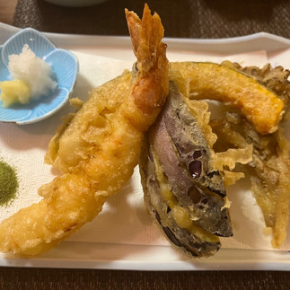 Tempura aus einer Garnele, Kürbis und Blumenkohl, wahnsinnig lecker.