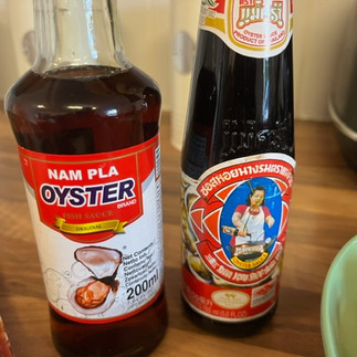 Eine sehr großzügige Menge Austernsauce, einige Spritzer Fischsauce dazu (keine Sorge, der gewöhnungsbedürftige Geruch wandelt sich in ein unvergleichlich köstliches Aroma), den Mörser mit Wasser knapp halb auffüllen, also ausspülen, und dieses auch in die Pfanne.