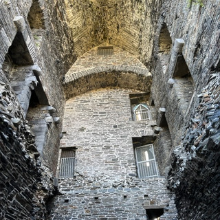 Schnell gepackt und verschwunden, gleich zum nebenan stehenden Rest eines Castles. Fünf Etagen; unten eine Halle, eine erstaunliche Wendeltreppe hoch, immer ein Raum, zuweilen zusätzlich eine Kammer, der eine Raum identisch auf vier Etagen. Ich bin bis nach oben gekrabbelt, das muss doch mühsam gewesen sein?! Immer hoch und runter...
